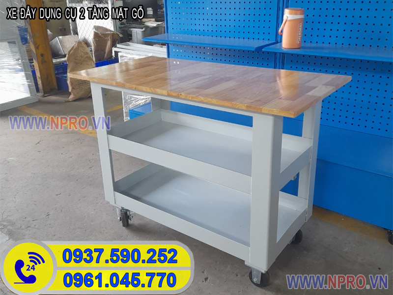 Xe đẩy 2 tầng mặt gỗ 18 ly hoặc 36 ly được sử dụng trong các nhà máy bảo trì, trạm bảo dưỡng máy móc, tiệm sửa xe máy, gara ô tô hay tại các xưởng gia công cơ khí