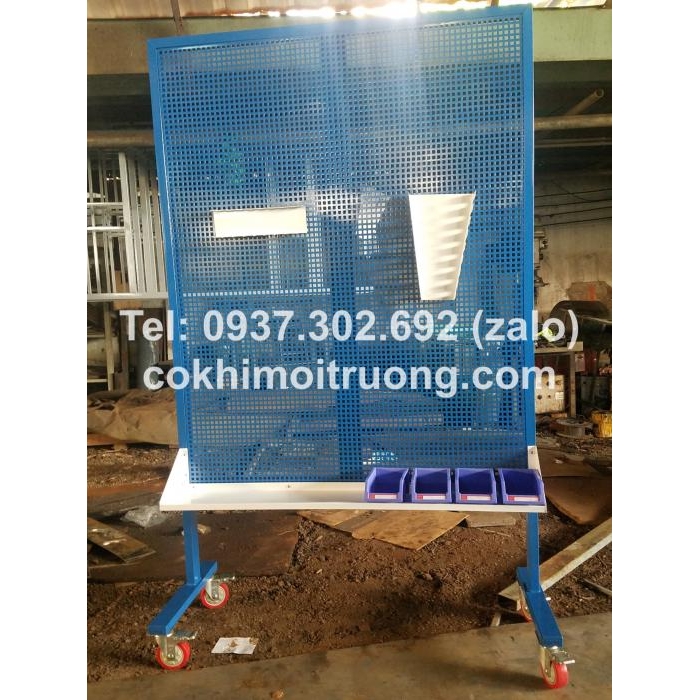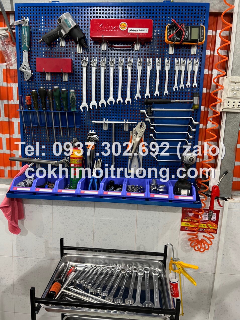 • Bảng sắt lỗ tròn hoặc lỗ vuông được đục sẵn giúp treo nhiều loại dụng cụ khác nhau.