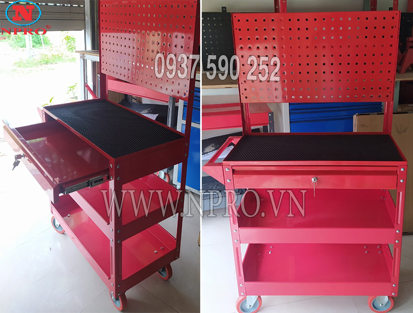 xe đẩy dụng cụ 3 ngăn màu đỏ​​ 1. Xe đẩy dụng cụ 3 ngăn Npro Nhãn hiệu: Npro/Việt Nam Màu sắc: Xám, đỏ Thông số kỹ thuật: