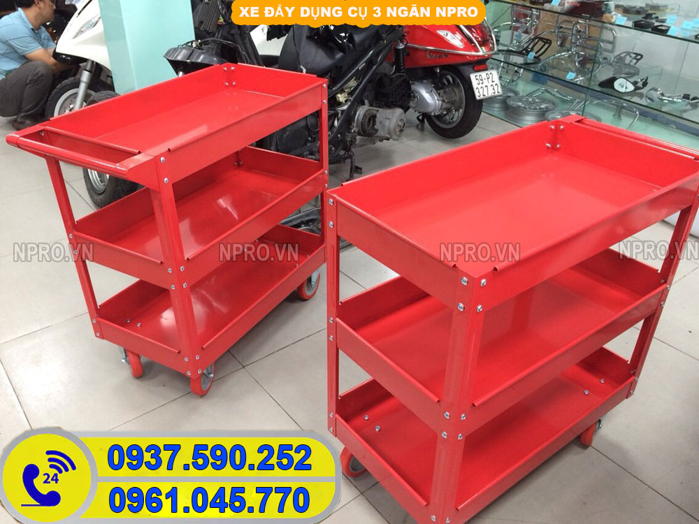 Hiện tại đây là chiếc xe đẩy dụng cụ 3 ngăn NPRO được sử dụng rộng rãi nhất trong các tiệm sửa xe, gara ô tô, khu nhà xưởng,...Với thiết kế 3 ngăn đơn giản, tiện lợi, đồ nghề được để lộ thiên và có tính lưu động rất cao. Một chiếc xe đẩy đựng dụng cụ 3 ngăn NPRO có tải trọng lên đến 150kg.