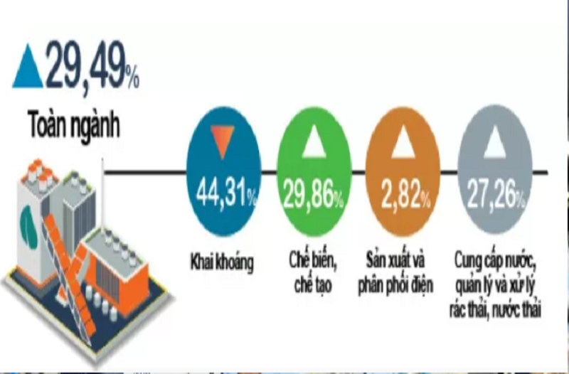 Trong đó, ngành chế biến, chế tạo tăng 29,86%, đóng góp 29,18 điểm phần trăm vào mức tăng chung; ngành sản xuất và phân phối điện, khí đốt, nước nóng, hơi nước và điều hòa không khí tăng 2,82%, đóng góp 0,07 điểm phần trăm; ngành cung cấp nước, hoạt động quản lý và xử lý rác thải, nước thải tăng 27,26%, đóng góp 0,41 điểm phần trăm; riêng ngành khai khoáng giảm 44,31%, làm giảm 0,17 điểm phần trăm.