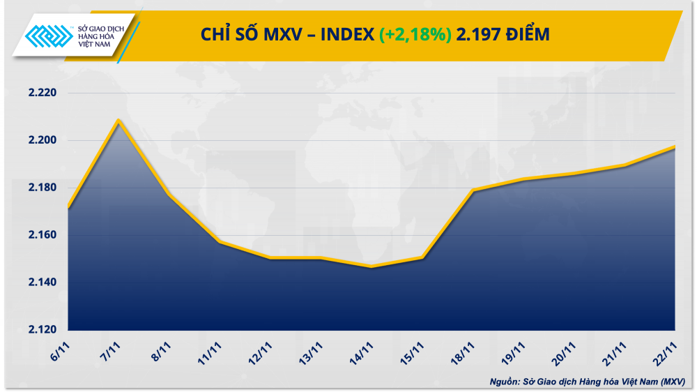 Theo Sở Giao dịch Hàng hóa Việt Nam (MXV), sắc xanh áp đảo trên bảng giá hàng hóa nguyên liệu thế giới trong tuần qua (18 - 24/11). Đóng cửa, chỉ số MXV-Index tăng 2,18% lên 2.197 điểm. Đáng chú ý là thị trường năng lượng với toàn bộ 5 mặt hàng đồng loạt tăng giá từ 4 đến 10% trong bối cảnh địa chính trị thế giới có nhiều diễn biến phức tạp. Bên cạnh đó, nhóm nguyên liệu công nghiệp cũng chứng kiến sự tăng giá mạnh của nhiều mặt hàng chủ chốt, nhất là hai mặt hàng cà phê.