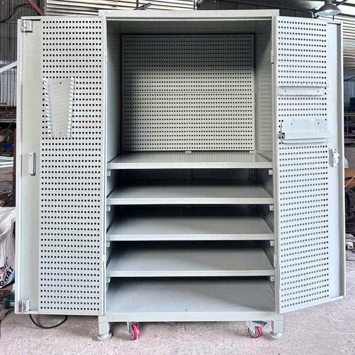Tủ dụng cụ 2 cánh 4 khay sơn tĩnh điện với thiết kế gồm 5 ngăn chứa dụng cụ đồ nghề, 2 cánh cửa kết hợp hệ thống bảng treo. Đây là dòng tủ dụng cụ cơ khí kết hợp bảng treo được nhiều nhà máy, xưởng cơ khí, khu công nghiệp lựa chọn.