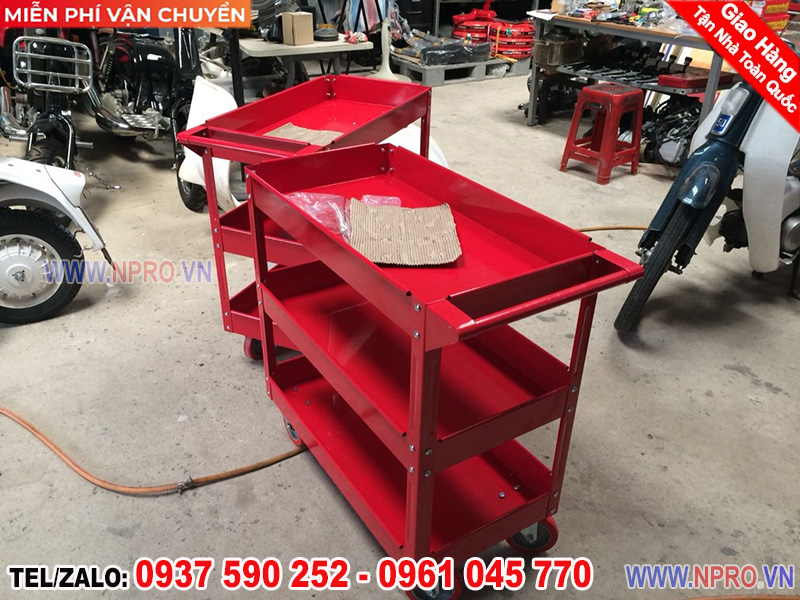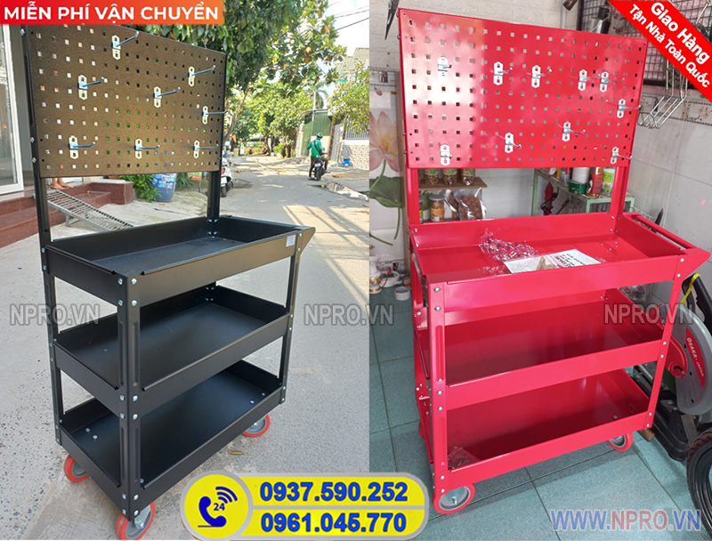 - Xe đẩy dụng cụ 3 ngăn NPRO: có kích thước là (c*d*r)(810*830*400mm) với khả năng chứa lớn lên đến 150kg và được sơn tĩnh điện 100% với màu đỏ và màu xám đen đặc trưng của tủ làm tăng sự sang trọng cho cửa tiệm. Dễ dàng lắp đặt - tháo rời thuận tiện cho việc di chuyển.