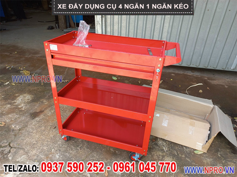 - Xe đẩy dụng cụ 4 ngăn có 1 ngăn kéo NPRO có kích thước là (c*d*r)(782*885*3820mm), khả năng chịu tải lớn và được sơn tĩnh điện 100% với màu đỏ đặc trưng của tủ làm tăng sự sang trọng cho cửa tiệm