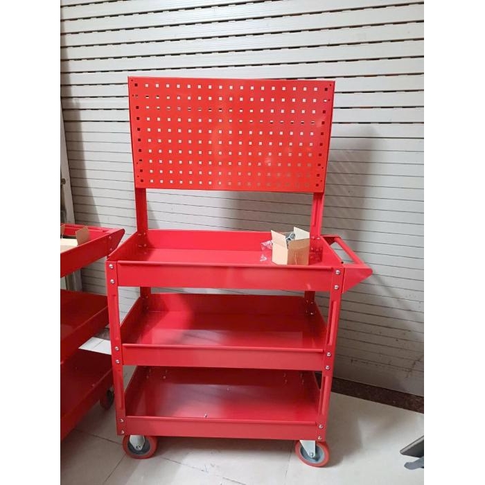Xe đẩy 3 ngăn có giá treo dụng cụ thiết bị hỗ trợ lưu trữ đồ nghề sửa chữa, dụng cụ cơ khí một cách gọn gàng, ngăn nắp và hiệu quả.