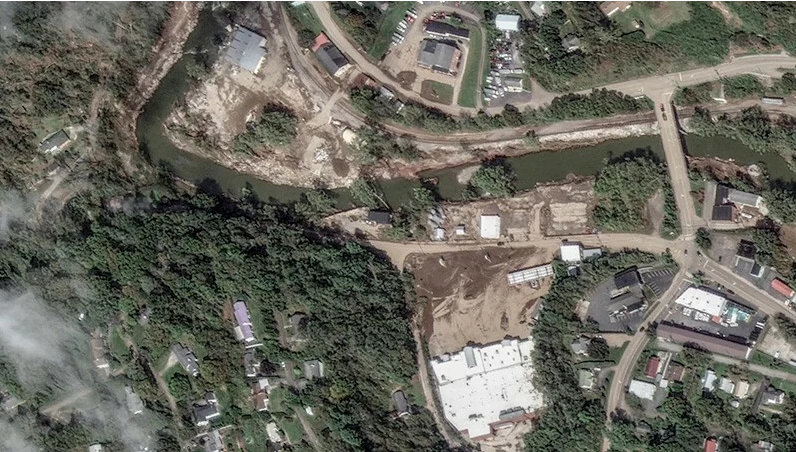 | Ảnh vệ tinh cho thấy tình trạng lũ lụt ở Sông North Toe và một khu chợ sau cơn bão Helene tại Spruce Pine, Bắc Carolina, Hoa Kỳ, ngày 2/10/2024. |