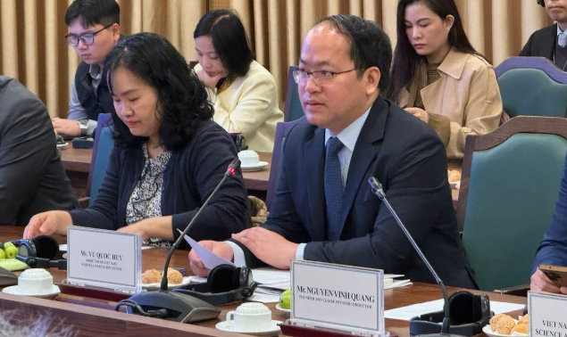 Ông Nguyễn Vinh Quang, Giám đốc FPT Semiconductor giới thiệu sáng kiến liên minh bán dẫn giữa Việt Nam và Nhật Bản trong giáo dục và chuỗi sản xuất. |