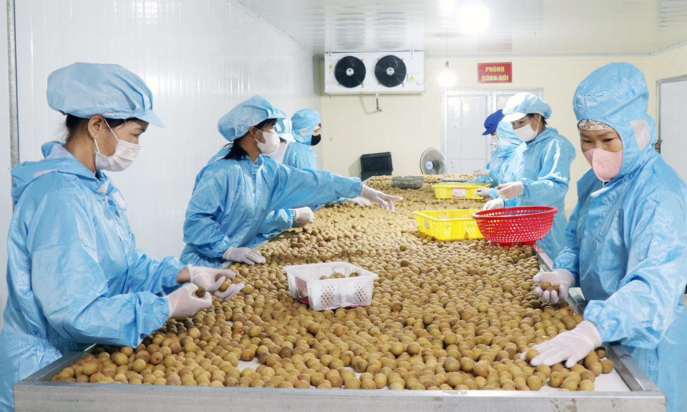 Hợp tác xã Nông nghiệp Thanh Hải (phường Chũ) sơ chế, đóng gói nhãn tươi xuất khẩu.